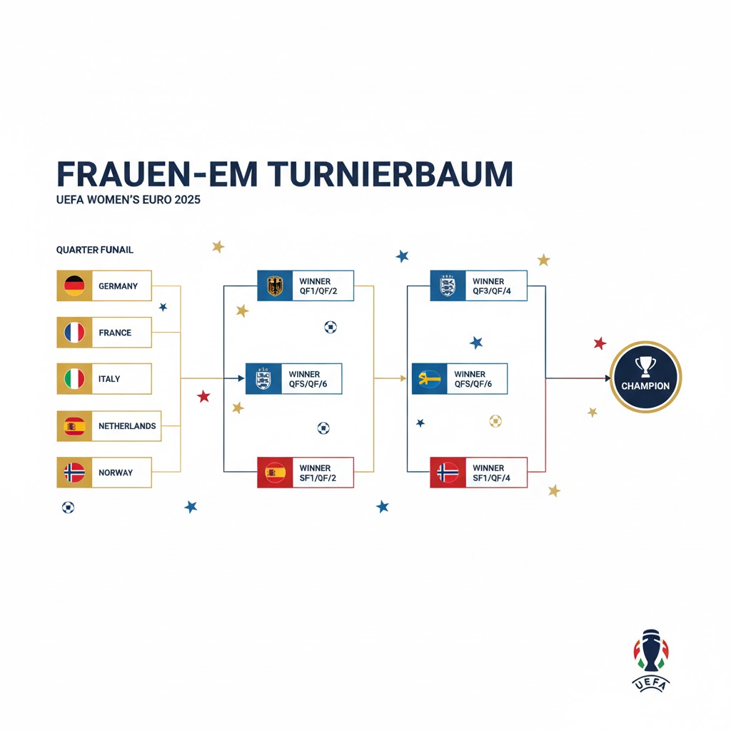 Der Frauen-EM Turnierbäum hilft Fans, den Überblick über das gesamte Turnier zu behalten. Man sieht, welche Teams sich gegenüberstehen, wer weiterkommt und wie der Weg zum Finale aussieht. Besonders für Gelegenheitsfans ist der Turnierbaum eine praktische Orientierungshilfe, um Spiele zu verfolgen und Favoriten zu identifizieren.